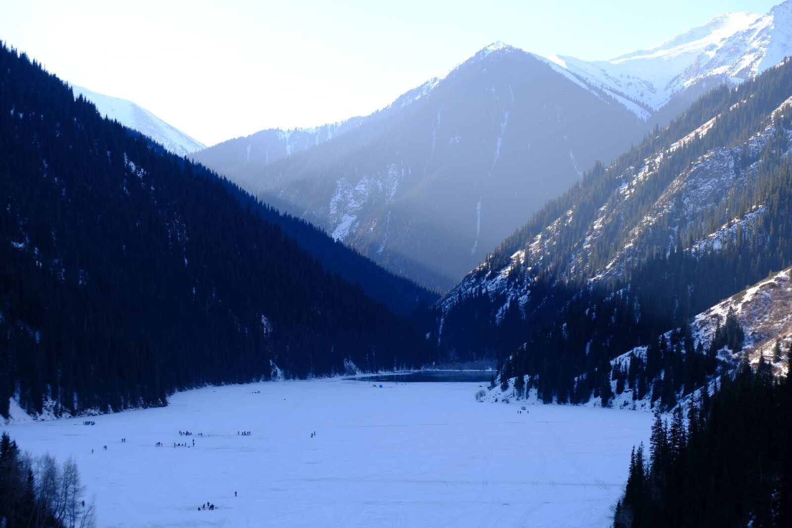 The Kolsai Lakes are a chain of alpine lakes located near the Kyrgyzstan border, known for their deep blue waters framed by forested slopes and mountain peaks. During our winter visit, accessibility was limited, and only the lower lake was reachable. Even there, the landscape had transformed completely under winter conditions.