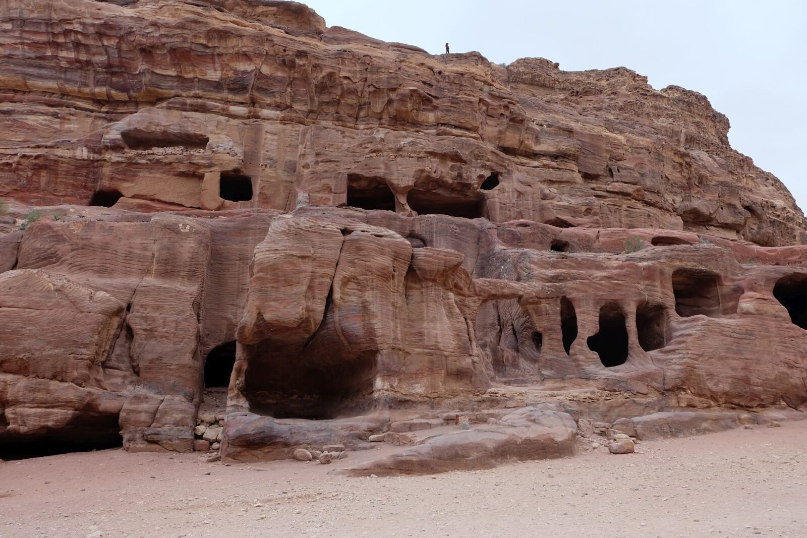 No photograph prepares you for scale. The façade rises more than forty metres, carved directly from the rose-red cliff, its symmetry both precise and improbable. It doesn’t feel decorative. It feels declarative — a statement made in stone, meant to be encountered, not admired from afar. We stood there longer than expected, not speaking much. The drizzle softened the colours, the crowd thinned momentarily, and Petra felt briefly suspended.